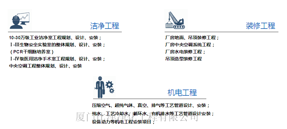 公司擁有建筑裝修裝飾工程專業(yè)承包二級、建筑機電安裝工程專業(yè)承包三級資質(zhì)、空氣凈化工程二級資質(zhì), 質(zhì)量管理體系認證,嚴格執(zhí)行ISO9001、ISO14644-1、GB/50430、OHSAS18001、ISO14001、GB50073—2001國家標準及國家醫(yī)藥GMP規(guī)范要求,致力于高品質(zhì)潔凈工程